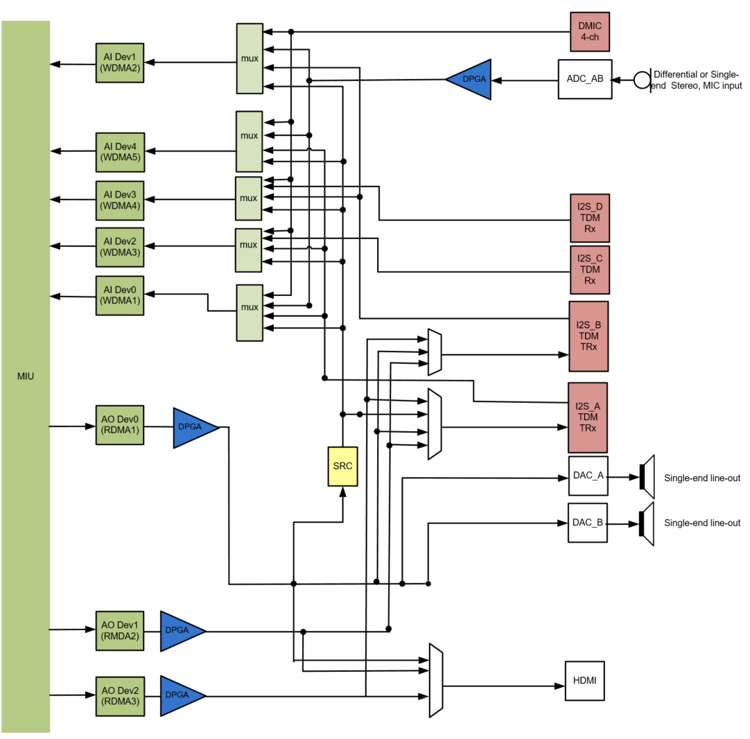 audio3.0中还包括另一类Device,即AI设备不经过DMA,直接将数据流送至AO设备,如(Amic→Lineout)。这一类device称为直通通路Device,即Passthrough,目前仅支持MI_AUDIO_PASSTHROUGH_DEV_1。
