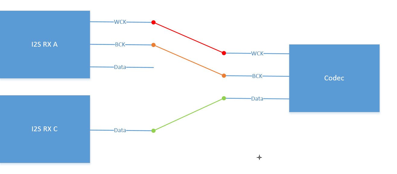 SGS的I2S有两种接线方式。一种是4-Wire模式,包括RX_WCK、RX_BCK、RX_SDI、TX_SDO四根线,此模式下,TX没有独立的clock,所有的clock均由RX提供,故在此模式下TX需要依赖RX来使用,没法单独使用TX,且I2S TX的参数需与I2S RX一致。另一种是6-Wire模式,包括RX_WCK、RX_BCK、RX_SDI、TX_WCK、TX_BCK、TX_SDO六根线,此模式下RX和TX各自独立,没有关联。
