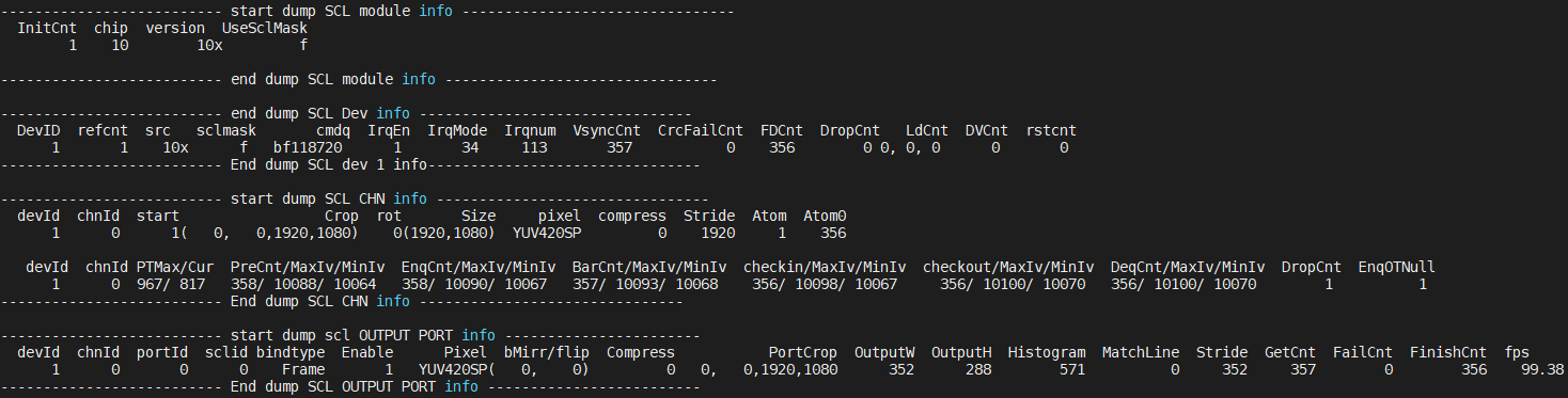 | 举例 | echo fpsth 0 0 30 30 > /proc/mi_modules/mi_scl/mi_scl0 //channel0 port0中小于30.30的fps打印出来 |