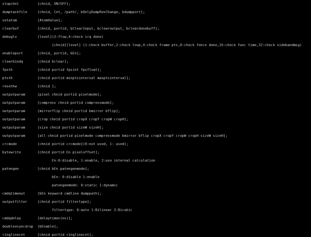 | 举例 | echo cmdqtimeout 1 cat /proc/mi_modules/mi_scl/mi_scl0 /mnt/cmdqerr.txt > /proc/mi_modules/mi_scl/mi_scl0 |