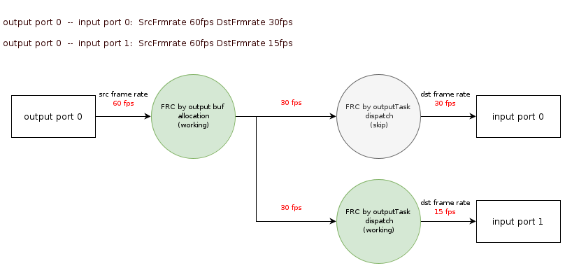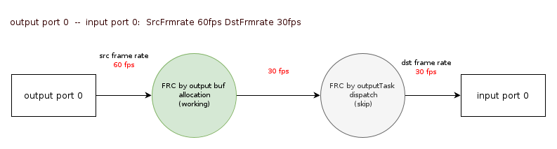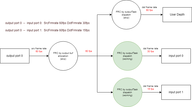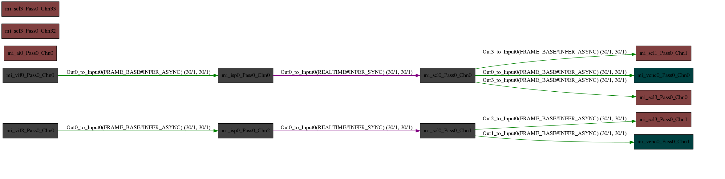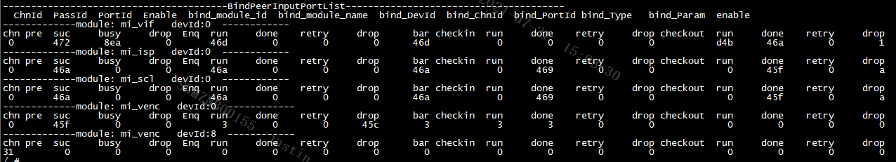 FinDMADispatch:MI SYS将MI PASS的output task中的buffer传递到绑定的下级MI PASS的input queue。Min Buffer产生(通常是 vif 开始处理 buffer 的时间)到该MI PASS对应Flow所经过的最小延时。 Max Buffer产生(通常是 vif 开始处理 buffer 的时间)到该MI PASS对应Flow所经过的最大延时。 Avg Buffer产生(通常是 vif 开始处理 buffer 的时间)到该MI PASS对应Flow所经过的平均延时。 Diff Buffer产生(通常是 vif 开始处理 buffer 的时间)到该MI PASS对应Flow所经过的当前延时。 Input port common info(only dump enabled Input port) ChnId 该input port所在的channel id。 PassId 该 input port 所在的 pass id。 PortId 该input port的id。 user_buf_quota 该InputPort的buff数目的Quota。 UsrInjectQ_cnt 该InputPort 里的UsrInjectBufQueue(usr inject进来还没处理完成的buf队列)里的buff数目。 BindInQ_cnt 该InputPort 里的BindInputBufQueue(由绑定前级enq进来还没处理完成的buf队列)里的buff数目。 TotalPendingBuf_size 该inputPort的cur_working_input_queue(还没开始处理,即将处理)里面各个buf的size总和。 usrLockedInjectCnt 用户当前拿到了多少个buf。 newPulseQ_cnt 该inputPort在new_pulse_fifo_inputqueue(input port buf缓存队列0)的buf数目。 nextTodoPulseQ_cnt 该inputPort在new_todo_pulse_inputqueue(input port buf缓存队列1)的buf数目。 curWorkingQ_cnt 该inputPort在cur_working_input_queue(还没开始处理,即将处理)的buf数目。 workingTask_cnt 该inputPort在input_working_tasklist(正在处理的input task的列表)的task数目。 lazzyRewindTask_cnt 该inputPort在lazzy_rewind_inputtask_list(即将回退到cur_working_input_queue队列中task列表)的task数目。 Enable 标记该input port是否enable。 bind_module_id 与该input port 进行了binded的output port所在的module的id。 bind_module_name 与该input port 进行了binded的output port所在的module的name。 bind_DevId 与该input port 进行了binded的output port所在的device的id。 bind_ChnId 与该input port 进行了binded的output port所在的channel的id。 bind_PortId 与该input port 进行了binded的output port的id。 bind_Type 绑定模式。 bind_Param 该input port进行bind时所带的参数。 enable 标记绑定的output port是否enable。 SrcFrmrate Src帧率。 DstFrmrate Dst帧率。 GetFrame/Ms 统计的帧数/统计所耗的时间。 FPS 实际帧率。 FinishCnt 该Input port finish buf的个数。 RewindCnt 该Input port rewind buf的个数。 DropCnt 该Input port drop buf的个数。 Output port common info (only dump enabled Output port) ChnId 该output port所在的channel的id。 PassId 该output port所在的pass的id。 PortId 该output port的id。 usrDepth User最多可以拿到的output buf数量。 BufCntQuota 该OutputPort的 buff数目的Quota。 usrLockedCnt 从UsrGetFifoBufQueue(用户获取output port buf的队列)里用户实际拿走了多少个buffer。 totalOutPortInUsed totalOutputPortInUsedBuf数目。 DrvBkRefFifoQ_cnt 该OutputPort的DrvBkRefFifoQueue(驱动预处理队列,目前没用到)里的buffer数目。 DrvBkRefFifoQ_size 该OutputPort的DrvBkRefFifoQueue(驱动预处理队列,目前没用到)里的buffer的总size。 UsrGetFifoQ_cnt 该OutputPort的UsrGetFifoBufQueue(用户获取output port buf的队列)里的buffer数目。 UsrGetFifoQ_size 该OutputPort的UsrGetFifoBufQueue(用户获取output port buf的队列)里的buffer的总size。 UsrGetFifoQ_seqnum 被加到UsrGetFifoBufQueue(用户获取output port buf的队列)的buf总个数。 UsrGetFifoQ_discardnum 由于UsrGetFifoBufQueue(用户获取output port buf的队列)满了而被discard的buf个数。 workingTask_cnt 当前在output_working_tasklist(正在处理的output task的列表)的task总个数。 finishedTask_cnt 当前在output_finished_tasklist(已经处理完成还没推到下一级的列表)的task总个数。 GetFrame/Ms 统计的帧数/统计所耗的时间。 FPS 实际帧率。 FinishCnt 该output port finish buf的总个数。 RewindCnt 该output port rewind buf的总个数。 GetTotalCnt 向mi_sys申请output buf的总次数。 GetOkCnt 向mi_sys申请output buf成功的次数。 BindPeerInputPortList ChnId 该output port所在的channel的id。 PassId 该output port所在的pass的id。 PortId 该output port的id。 Enable 标记该output是否enable。 bind_module_id 与该output port 进行了binded的input port list中的其中一个input port(以下简称该binded input port)所在的module的id。 bind_module_name 该binded input port所在的module的name。 bind_DevId 该binded input port所在的device id。 bind_ChnId 该binded input port所在的channel id。 bind_PortId 该binded input port的id。 bind_Type 绑定模式。 bind_Param 绑定时所下的参数。 enable 标记已绑定的input port是否enable。 Output buffer sequence