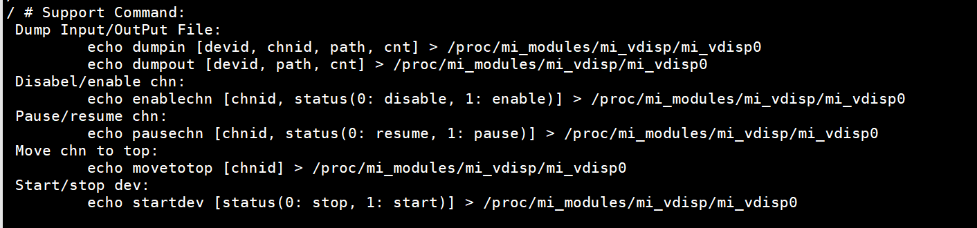 | 举例 | echo enablechn 0 0 > /proc/mi_modules/mi_vdisp/mi_vdisp0 |