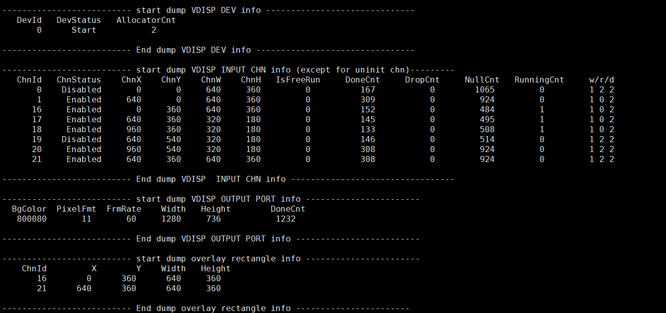 记录当前VDISP的使用状况以及device属性、Input channel属性、Output port属性以及overlay通道切割后的小矩形属性,可以动态地获取到这些信息,方便调试和测试。