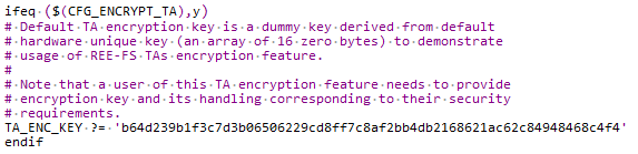 - TA_ENC_KEY:编译TA过程中,用来加密TA的key。在optee_os/ta/arch/arm/link.mk中指定,在系统中会以tee_otp_get_ta_enc_key() 的行为产生这把key,而默认的tee_otp_get_ta_enc_key() 行为是以HUK来产生TA_ENC_KEY。图1中的TA_ENC_KEY即是以默认的HUK所产生的。请注意,这部分原生代码仅做为演示功能,请替换自己的key。
